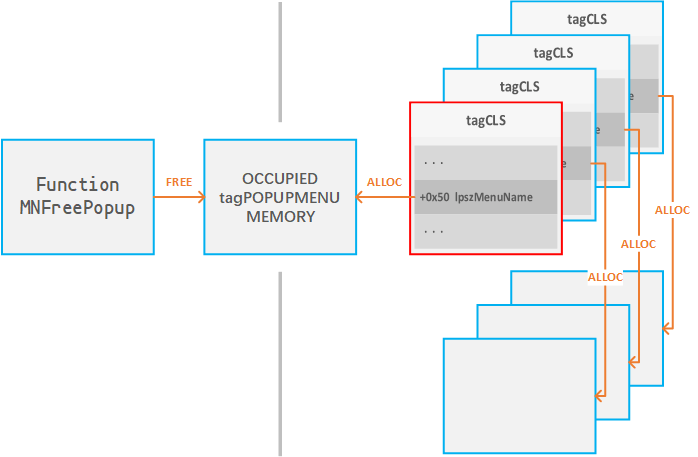 Since there is a calling statement of xxxSendMessage to send MN_SETTIMERTOOPENHIERARCHY message before calling function xxxMNHideNextHierarchy, it would be caused that the execution calls back into the user process. Therefore, during this time, attackers can trigger the logic to free or reallocate the memory of the target popup menu object in the user process, which causes the target memory area pointed to by parameter popupMenu to hold uncontrollable data. If the attacking code deliberately constructs the data in the memory block reallocated in the original position, the execution flow in kernel context would possibly enter the exploiatation code located in the user process address space directly when sending message to the submenu window object in function xxxMNHideNextHierarchy.