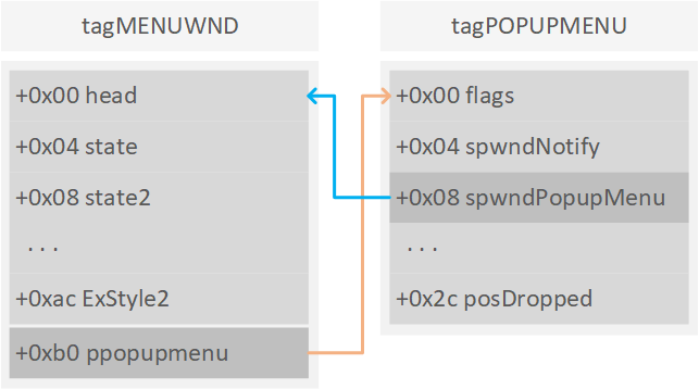 In Windows kernel, the displaying of menu objects is accomplished through the special type of window tagWND object - #32768(MENUCLASS) classed menu window object, whose extra area holds the pointer to associated popup menu tagPOPUPMENU object.
