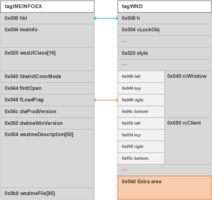 Field piiex of keyboard layout structure points to the associated extended IME information object. The object pointed to by this field will be used as the target address of the memory copy in function SetImeInfoEx. Field pklNext and pklPrev are pointers to the next and the previous node objects. The keyboard layout object list is linked up by the two pointer fields.