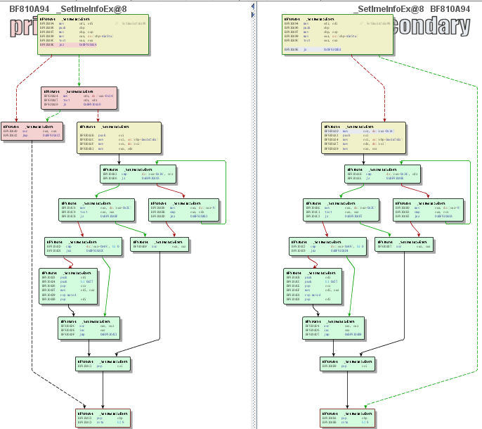 With the check of these modified functions one by one, function SetImeInfoEx is noticed that its code block changes as below: