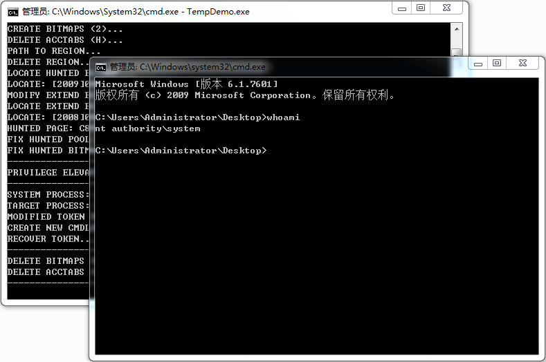 Token 替换回原来的值以保证释放进程 Token 时不会发生异常,当前进程的任务就完成了。接下来进行后续的善后操作,随后进程正常退出。在新启动的命令提示符进程中使用