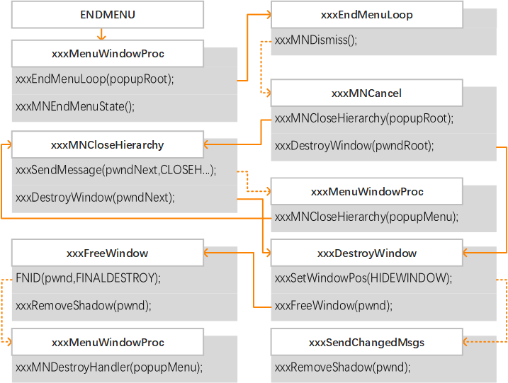 系统调用 xxxMNEndMenuState 函数来清理菜单状态结构体存储的信息与释放相关的弹出菜单对象和窗口对象。