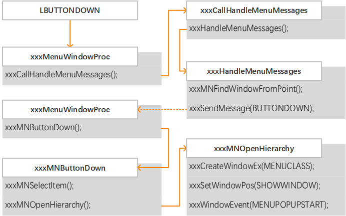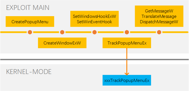 菜单管理是 win32k 中最复杂的组件之一,菜单处理作为一个整体依赖于多种十分复杂的函数和结构体。例如,在创建弹出菜单时,应用程序调用 TrackPopupMenuEx 在菜单内容显示的位置创建菜单类的窗口。接着该菜单窗口通过一个系统定义的菜单窗口类过程 xxxMenuWindowProc 处理消息输入,用以处理各种菜单特有的信息。此外,为了追踪菜单如何被使用,win32k 也将一个菜单状态结构体 tagMENUSTATE 与当前活跃菜单关联起来。通过这种方式,函数能够知道菜单是否在拖拽操作中调用、是否在菜单循环中、是否即将销毁,等等。