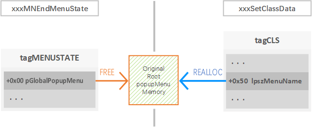 在函数 xxxMNEndMenuState 中,系统从当前线程的线程信息对象中获取 pMenuState 成员域指向的菜单状态结构体对象。随后函数判断菜单状态结构体对象的成员域 pGlobalPopupMenu 是否为空,不为空则调用函数 MNFreePopup 释放该成员域指向的弹出菜单 tagPOPUPMENU 对象。在执行相应的预处理之后,函数 MNFreePopup 调用 ExFreePoolWithTag 释放传入的 tagPOPUPMENU 对象缓冲区。